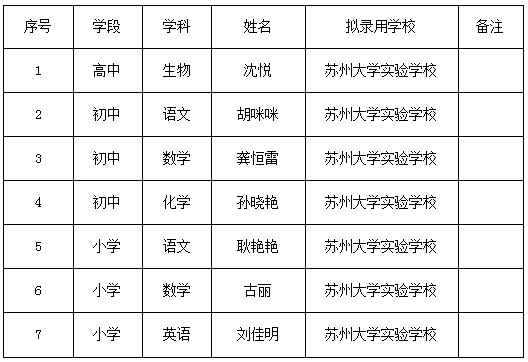 根據(jù)《2021年蘇州大學(xué)實(shí)驗(yàn)學(xué)校公開招聘教師簡章》規(guī)定,經(jīng)公開報(bào)名、筆試、面試、考察(政審)、體檢等程序,初步確定擬錄取以下7名同志為相城區(qū)年金制教師,現(xiàn)予以公示,公示時(shí)間為7個(gè)工作日(5月8日—5月17日)。