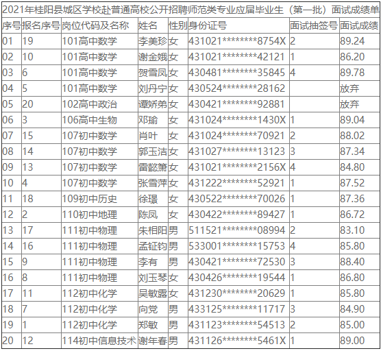 附件:2021年桂陽縣城區(qū)學(xué)校赴普通高校公開招聘師范類專業(yè)應(yīng)屆畢業(yè)生(第一批)面試成績公示表