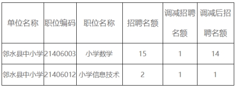 根據(jù)廣安市人力資源和社會(huì)保障局廣安市教育和體育局《關(guān)于2021年廣安市公開(kāi)考試招聘中小學(xué)教師的公告》的要求,現(xiàn)將因報(bào)名人數(shù)達(dá)不到開(kāi)考比例須調(diào)整招聘名額的職位公告如下:
