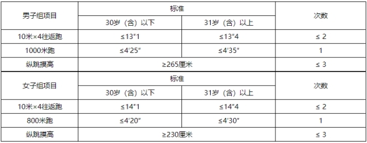 2.體能測評按照《公安機關(guān)錄用人民警察體能測評項目和標準(暫行)》(人社部發(fā)〔2011〕48號)等文件規(guī)定的程序、項目、標準和次數(shù)組織實施。體能測評項目、標準和次數(shù)為: