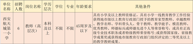 按照《西安市事業(yè)單位公開招聘工作人員實施辦法》(市人社發(fā)〔2020〕10號)及《西安航天基地公辦學校2021年公開招聘事業(yè)編制高層次人才公告》的有關(guān)規(guī)定,西安航天城第一小學面向社會公開招聘事業(yè)編制高層次人才,具體公告如下: