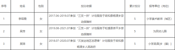 根據(jù)《關(guān)于2021年政和縣中小學幼兒園新任教師公開招聘工作的通知》(政教綜〔2021〕22號)中“四、筆試事項(五)加分手續(xù)辦理:按照省上的有關(guān)規(guī)定,對參加‘三支一扶計劃’‘志愿服務(wù)西部計劃’(含研究生支教團)‘志愿服務(wù)欠發(fā)達地區(qū)計劃’‘高校畢業(yè)生服務(wù)社區(qū)計劃’等服務(wù)基層項目當年服務(wù)行將期滿考核合格和服務(wù)期滿考核合格的高校畢業(yè)生,報考中小學幼兒園新任教師非專門崗位按現(xiàn)行規(guī)定享受筆試加分政策”,“符合加分條件的人員攜帶相關(guān)證書原件及復(fù)印件1份(A4紙)于5月10日—12日(正常上班時間)到政和縣教育局人事股現(xiàn)場辦理”,F(xiàn)對經(jīng)人事股工作人員在規(guī)定時間內(nèi)現(xiàn)場確認后,符合加分條件的人員情況給予公示。