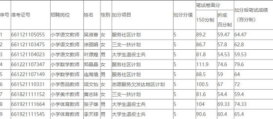 根據(jù)《2021年漳州市公開考試招聘中小學(xué)幼兒園新任教師方案》的精神,符合加分政策的報(bào)考人員若筆試卷面分達(dá)到合格線的可享受加分待遇。經(jīng)審核,現(xiàn)將2021年漳州市龍文區(qū)公開考試招聘中小學(xué)幼兒園新任教師筆試加分人員予以公示(公示期為5個(gè)工作日:2021年5月20-26日)。如有異議,請與龍文區(qū)教育局人事職改股聯(lián)系,電話:0596-2638810,來信地址:漳州市龍文區(qū)教育局人事職改股,郵編:363005。