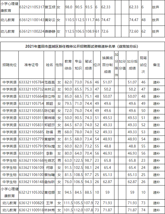 現(xiàn)將2021年5月21日新任教師招聘擬參加面試對(duì)象資格復(fù)核放棄及遞補(bǔ)對(duì)象公布如下,請(qǐng)遞補(bǔ)對(duì)象于5月25日下午2:30持相關(guān)材料到區(qū)教育局組織人事股(908室)進(jìn)行資格復(fù)核,逾期視為自動(dòng)放棄。面試資格審核提交材料及要求詳見荔城區(qū)人民政府教育專欄公告公示欄5月19日發(fā)布的《2021年荔城區(qū)新任教師公開招聘面試等有關(guān)事項(xiàng)通知》。