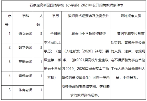 通過(guò)人員,由石家莊高新區(qū)國(guó)杰學(xué)校(小學(xué)部)對(duì)擬聘人員進(jìn)行崗前培訓(xùn),一周培訓(xùn)考核期,經(jīng)培訓(xùn)考核合格后方可上崗。
