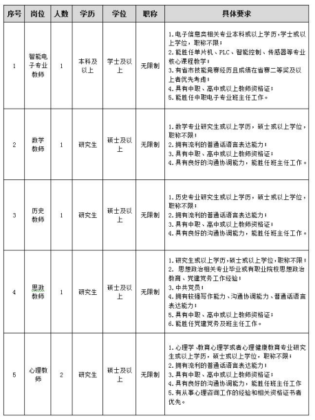 為適應(yīng)創(chuàng)建高水平中職學(xué)校和專業(yè)轉(zhuǎn)型升級(jí)的需要,進(jìn)一步吸引和凝聚優(yōu)秀人才、優(yōu)化師資隊(duì)伍建設(shè)配置,面向社會(huì)公開招聘聘用制教職人員。具體如下: