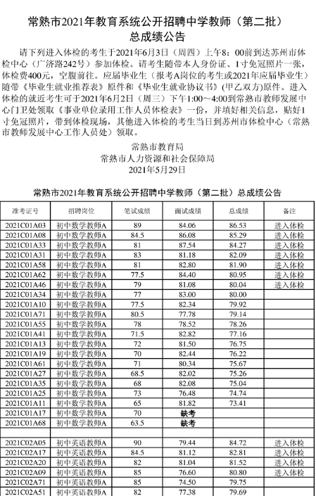 2021年江蘇省蘇州常熟市教育系統(tǒng)公開招聘中學(xué)教師(第二批)總成績公告