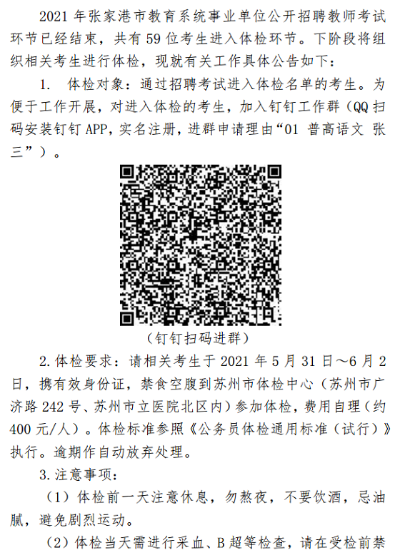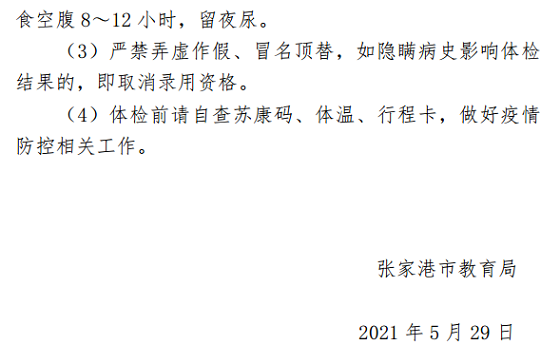 2021年江蘇省蘇州關(guān)于張家港市教育系統(tǒng)事業(yè)單位公開(kāi)招聘教師體檢工作的公告