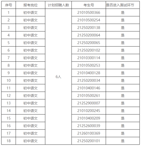 根據(jù)《實施方案》規(guī)定:面試人數(shù)原則按照筆試合格人員1:3的比例進(jìn)入面試。本次招聘應(yīng)核減初中語文教師崗位2個,實際招聘崗位為6個,進(jìn)入面試環(huán)節(jié)的人員18名。按照參加資格復(fù)審人員的筆試成績由高到低的順序確定進(jìn)入面試環(huán)節(jié)人員的原則,現(xiàn)對我局2021年5月31日發(fā)布的《2021年錫林浩特市特崗教師招聘面試公告》中的初中語文教師崗位數(shù)及面試人員更正如下: