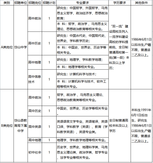 本次擬面向社會公開招聘A類崗位為緊缺專業(yè)人才4名,具體崗位為高中政治、高中歷史、高中地理、高中信息技術(shù)各1名;B類崗位為下屬中學(xué)教師5名,具體崗位為高中政治、高中歷史、高中英語、高中地理、初中社會。具體見下表: