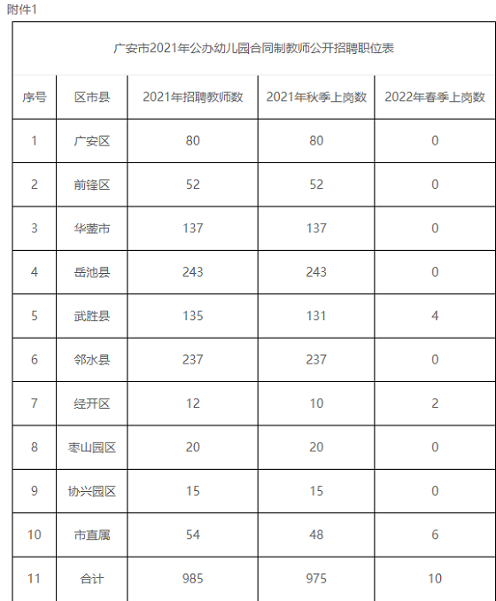 附件:1.廣安市2021年公辦幼兒園合同制教師公開招聘職位表