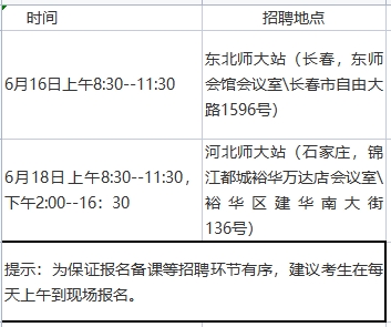 豐南區(qū)選聘教師工作小組于2021年6月中旬赴部分高校招聘點組織選聘工作(高校招聘點為東北師范大學(xué)、河北師范大學(xué))。符合條件畢業(yè)生可按照就近報名原則到招聘點現(xiàn)場報名參加選聘。報名時需由本人提交身份證、《教育部學(xué)籍在線驗證報告》、教師資格證書或教師資格考試合格證明、所學(xué)專業(yè)為師范類專業(yè)證明信、《普通高校畢業(yè)生就業(yè)協(xié)議書》、在校期間榮譽獎勵證書、《唐山市豐南區(qū)2021年面向重點師范院校選聘教師報名登記表》,以上材料原件審核后交A4紙復(fù)印件一份。選聘時間、地點安排如下表: