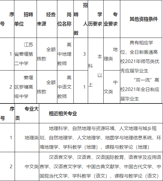 為進一步加強教師隊伍建設,優(yōu)化教師隊伍結構,為提升教育教學質量夯實基礎,根據(jù)《江蘇省事業(yè)單位公開招聘人員辦法》《關于進一步做好全省中小學校新進教師公開招聘工作的意見》《關于進一步做好全市中小學教師公開招聘工作的通知》精神,江蘇省姜堰第二中學、泰州市姜堰區(qū)羅塘高級中學將招聘全額撥款事業(yè)編制緊缺學科教師4名,F(xiàn)將有關事項公告如下: