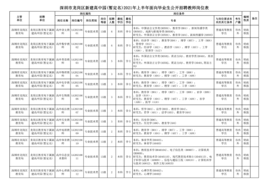 1.深圳市龍崗區(qū)新建高中園2021年上半年面向畢業(yè)生公開招聘教師崗位表