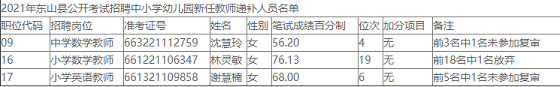 現(xiàn)將2021年?yáng)|山縣公開(kāi)招聘中小學(xué)幼兒園新任教師遞補(bǔ)人員名單公示如下,如有異議請(qǐng)及時(shí)與我們聯(lián)系,聯(lián)系電話:0596-5889391。請(qǐng)進(jìn)入遞補(bǔ)的考生保持手機(jī)通訊暢通,具體事宜另行電話通知。
