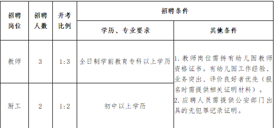 4.幼兒園教師年齡要求35周歲以下(1986年1月1日以后出生),廚工45周歲以下(1976年1月1日以后出生)。