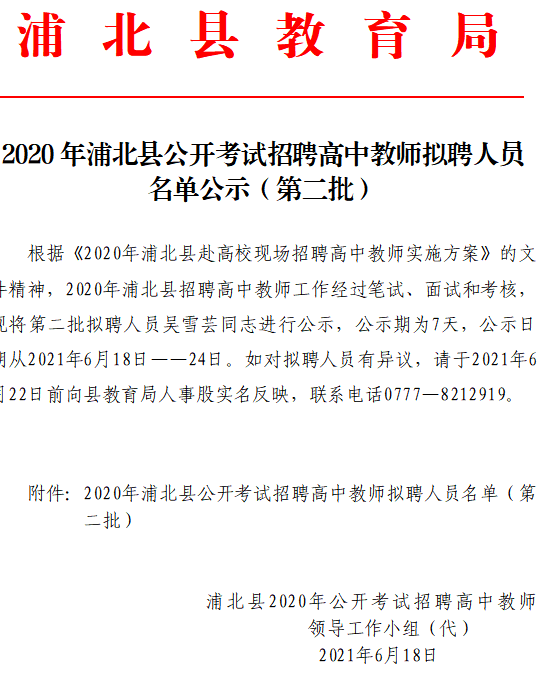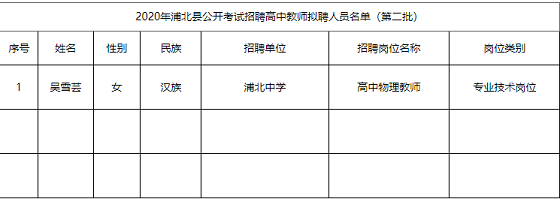 2020年廣西欽州市浦北縣公開考試招聘高中教師擬聘人員名單公示(第二批)