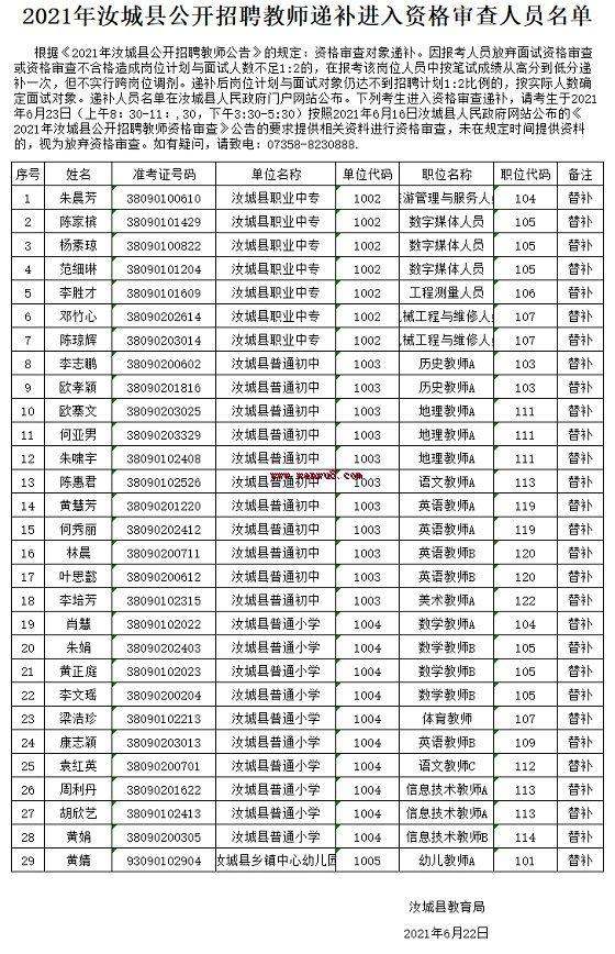 2021年湖南郴州汝城縣公開(kāi)招聘教師遞補(bǔ)進(jìn)入資格審查人員名單公示