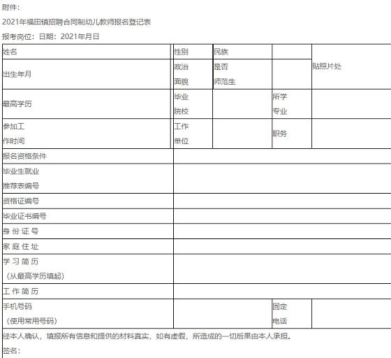 附件:《2021年福田鎮(zhèn)招聘合同制幼兒教師報(bào)名登記表》