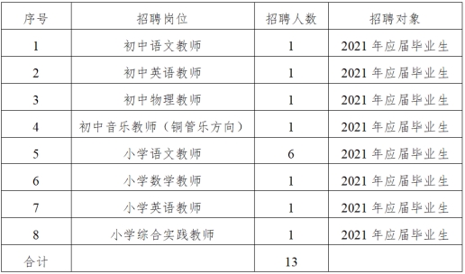 (一)招聘人數(shù)本次共招聘公辦中小學編制外剛需聘用教師13名。具體崗位及招聘條件見《東莞市南城街道2021年第三批公開招聘公辦中小學剛需聘用教師崗位表》(附件2,下稱《崗位表》)。