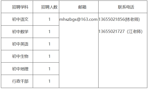 2.報(bào)名方式:符合規(guī)定報(bào)名條件的應(yīng)聘人員每人限報(bào)1個(gè)崗位志愿,并在規(guī)定時(shí)間內(nèi)將報(bào)名相關(guān)材料(詳見(jiàn)本公告附件2,網(wǎng)絡(luò)報(bào)名需提交原件掃描件)發(fā)送至學(xué)校郵箱(mhszbgs@163.com,郵件以“姓名+學(xué)科”命名),并在工作日(工作時(shí)間:上午8:00-11:30,下午2:30-5:00)撥打高新一中辦公室電話(huà)13655021727(江老師)確認(rèn)收件情況。各崗位要求提供的所有證件、證明材料等均須于報(bào)名第一日(含)前取得,落款時(shí)間為報(bào)名第一日(含)前。