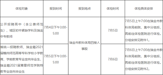 根據(jù)工作安排,現(xiàn)將瑞金市2021年招聘中小學(xué)幼兒園教師體檢工作公告如下: