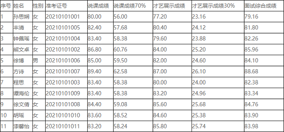 根據(jù)2021年6月21日《2021年團(tuán)風(fēng)縣從定向培養(yǎng)生中專項(xiàng)公開招聘農(nóng)村小學(xué)全科教師、鄉(xiāng)鎮(zhèn)公辦幼兒園教師公告》要求,2021年團(tuán)風(fēng)縣從定向培養(yǎng)生中專項(xiàng)公開招聘農(nóng)村小學(xué)全科教師、鄉(xiāng)鎮(zhèn)公辦幼兒園面試工作已完成,現(xiàn)將考生面試成績(jī)公示如下: