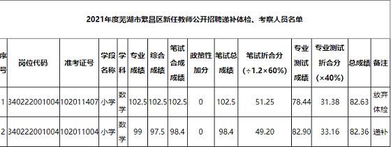 根據(jù)《2021年度蕪湖市中小學(xué)新任教師公開招聘公告》規(guī)定,對(duì)體檢、考察出現(xiàn)缺額的,在同崗位報(bào)考人員中,按考試最終成績從高分到低分依次等額遞補(bǔ),F(xiàn)將2021年度蕪湖市繁昌區(qū)中小學(xué)新任教師公開招聘遞補(bǔ)體檢、考察人員公示如下。