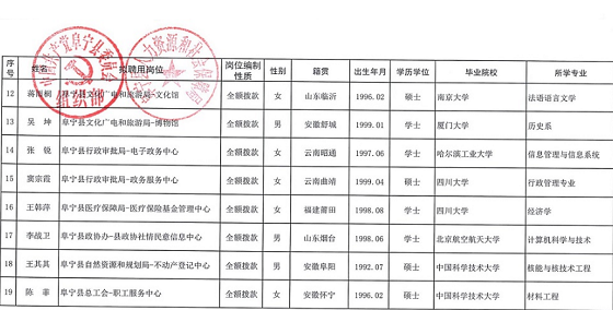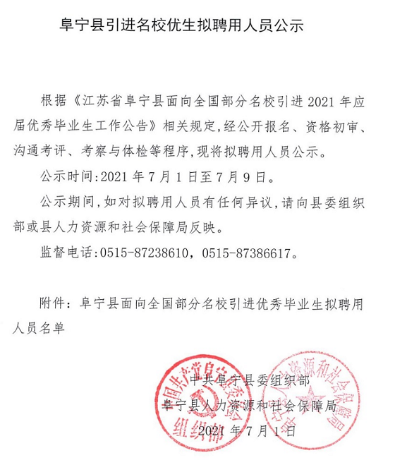 2021年江蘇省鹽城阜寧縣引進(jìn)名校優(yōu)生擬聘用人員公示