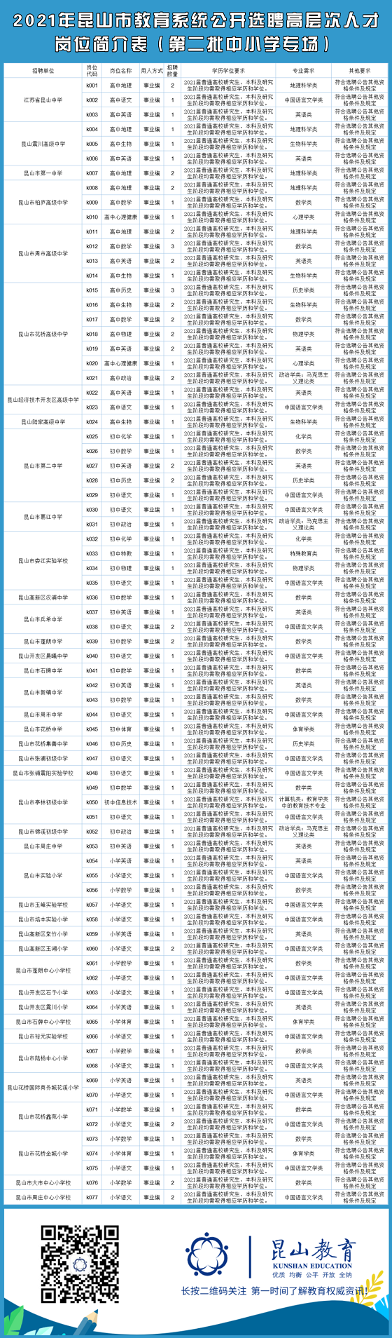 詳見《2021年昆山市教育系統(tǒng)公開選聘高層次人才崗位簡介表(第二批中小學(xué)專場)》。