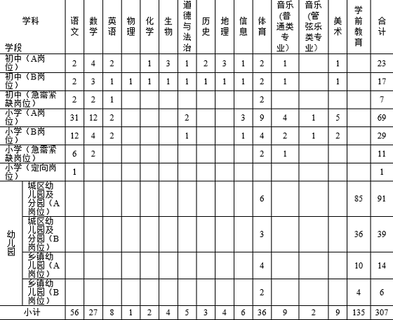 本次計(jì)劃招聘教師307名,其中初中教師47名、小學(xué)教師110名、幼兒園教師150名。具體招聘崗位、計(jì)劃見(jiàn)下表。