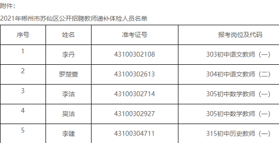 按照放棄體檢和體檢不合格人員1∶1的比例,在參加面試人員中按同一報(bào)考崗位綜合成績從高分到低分的順序確定遞補(bǔ)體檢對(duì)象。具體人員名單見《2021年郴州市蘇仙區(qū)公開招聘教師遞補(bǔ)體檢人員名單》。