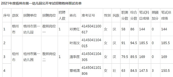 根據(jù)《梧州市2021年面向社會公開考試招聘事業(yè)單位(中小學教師崗位)人員簡章》要求,通過筆試、面試資格審核,現(xiàn)將鄧美紅等4位符合面試資格進入面試的人員進行公示(名單見附件)。公示時間2021年7月9日—15日,共7天。在公示期間,如果對以上人員有異議,請以書面形式署真實的姓名和聯(lián)系方式,于2021年7月15日之前以郵寄或直接送達梧州市第一幼兒園(直接送的以送達日期為準;郵寄的以郵戳日期為準)。郵政編碼543000,聯(lián)系電話0774—2823178。