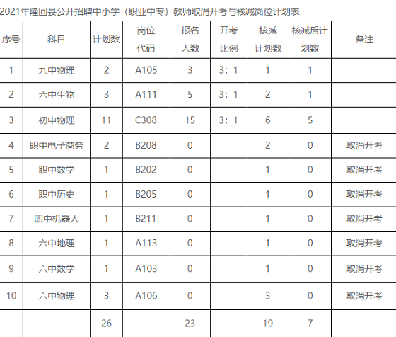 根據(jù)《2021年隆回縣公開(kāi)招聘中小學(xué)(職業(yè)中專(zhuān))教師公告》及報(bào)名實(shí)際情況,經(jīng)研究,核減未達(dá)到開(kāi)考比例和無(wú)人報(bào)名崗位計(jì)劃19名。詳情見(jiàn)《2021年隆回縣公開(kāi)招聘中小學(xué)(職業(yè)中專(zhuān))教師取消開(kāi)考與核減崗位計(jì)劃表》。