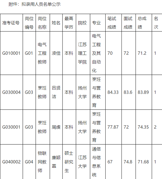 江蘇省惠山中等專業(yè)學(xué)校2021年公開招聘專業(yè)技能教師已完成考核階段各個環(huán)節(jié)的工作,考生體檢、考察均合格,擬予以錄用,F(xiàn)將擬錄用考生名單予以公示(見附件),公示時間:2021年7月12日至2021年7月20日,公示期滿無異議,考生可和招聘單位進行簽約。