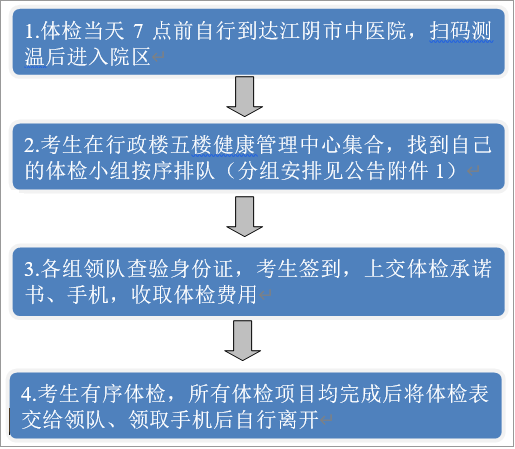 請參加體檢的人員帶好本人身份證(其余證件一律無效)于7月21日(周三)上午7:00前到江陰市中醫(yī)院(人民中路130號,公交1路、2路、11路、19路等都可到)行政樓五樓健康管理中心集中。體檢費由考生自理(450元,收取現(xiàn)金,請自備零錢)。逾期未到者作自動放棄處理。
