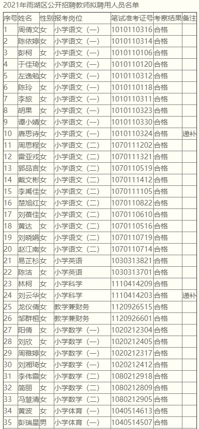 附:《2021年雨湖區(qū)公開招聘教師擬聘用人員名單》