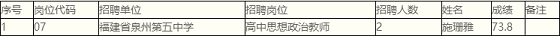 根據(jù)《2021年泉州市直公立學校專項公開招聘新任教師公告(二)》,現(xiàn)將2021年泉州市直公立學校專項公開招聘新任教師入圍人員成績公示如下,公示時間:2021年7月22日--2021年7月28日。若有疑問,請咨詢0595-22781630。