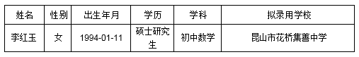 根據(jù)《2021年昆山市教育系統(tǒng)公開招聘高層次人才公告》,李紅玉(人員信息附后)已通過昆山市教育局組織的面試、體檢(因懷孕緩檢)和考察,F(xiàn)進(jìn)行錄用公示,公示時(shí)間為2021年7月23日~2021年8月2日。如對(duì)公示對(duì)象有異議,可在公示期間向昆山市教育局反映,聯(lián)系電話:57553129。