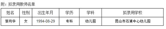 根據(jù)《2021年昆山市教育系統(tǒng)公開招聘幼兒園備案制教師簡章》,鄒月華(人員信息附后)已通過昆山市教育局組織的筆試、面試、體檢(因懷孕緩檢)和考察,現(xiàn)進(jìn)行錄用公示,公示時間為2021年7月23日~2021年8月2日。如對公示對象有異議,可在公示期間向昆山市教育局反映,聯(lián)系電話:57553129。
