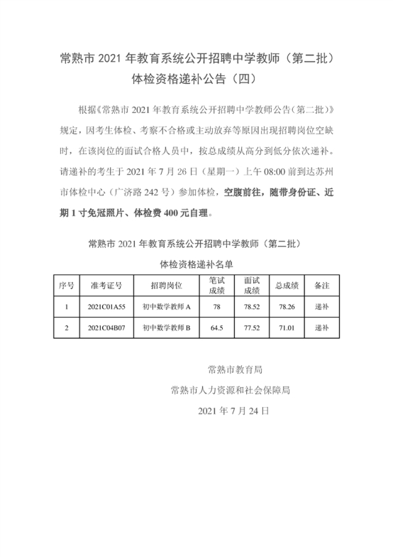 2021年蘇州常熟市教育系統(tǒng)公開招聘中學(xué)教師(第二批)體檢資格遞補公告(四)