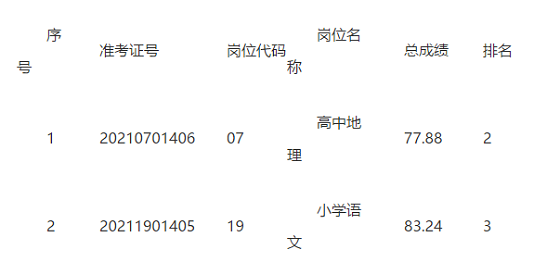 根據(jù)《通州灣示范區(qū)教育系統(tǒng)2021年公開(kāi)招聘教師公告》有關(guān)規(guī)定,現(xiàn)對(duì)體檢不合格或主動(dòng)放棄的部分職位,從考試總成績(jī)合格人員中,從高分到低分依次確定體檢遞補(bǔ)人員。現(xiàn)公告如下: