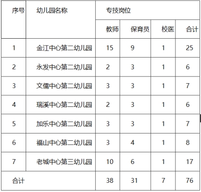 因工作需要,澄邁縣金江中心第二幼兒園等7所公辦幼兒園招聘勞務(wù)派遣人員76名,現(xiàn)將有關(guān)事項公告如下: