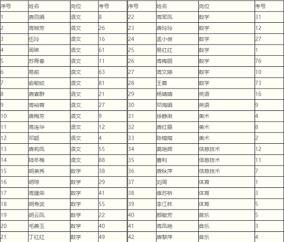 根據(jù)《全州縣2021年公開選拔教師進(jìn)縣城小學(xué)任教方案》的有關(guān)規(guī)定,按公選程序,已完成發(fā)布公選信息、組織報(bào)名、組織筆試、計(jì)附加分、公布成績等工作環(huán)節(jié),即將進(jìn)入考核環(huán)節(jié)。依據(jù)公選方案:1.所設(shè)選拔崗位如果報(bào)名人數(shù)與選拔名額達(dá)不到3:2,則按比例減少選拔名額,如減少名額后仍達(dá)不到比例要求的,則該崗位不予開考。2.考生的考試總成績=筆試成績+附加分;3.根據(jù)筆試和附加分的總成績從高分到低分等額確定考核人選。按照上述規(guī)定,現(xiàn)將全州縣2021年度公開選拔教師進(jìn)縣城小學(xué)任教入圍考核人員名單予以公告。