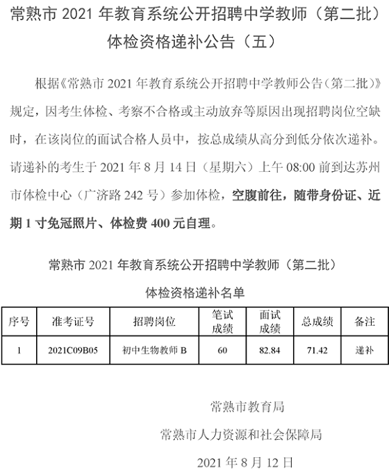 2021年江蘇蘇州常熟市教育系統(tǒng)公開招聘中學(xué)教師(第二批)體檢資格遞補公告(五)