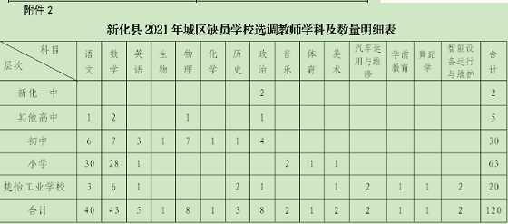 2.《新化縣2021年城區(qū)缺員學(xué)校選調(diào)教師學(xué)科及數(shù)量明細(xì)表》