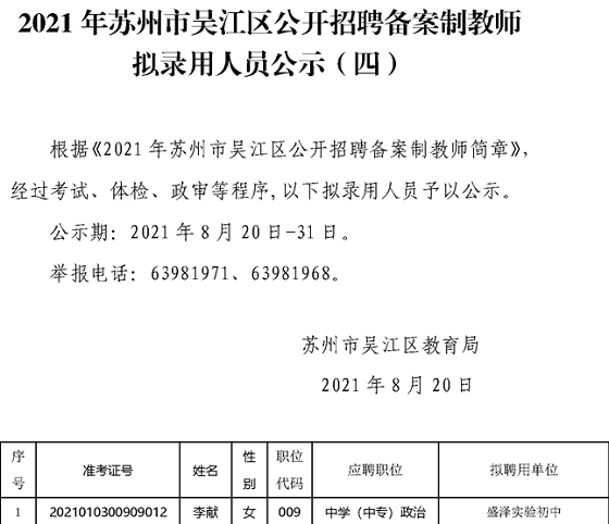 2021年江蘇蘇州市吳江區(qū)公開(kāi)招聘?jìng)浒钢平處煍M錄用人員公示(四)