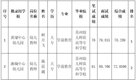 根據(jù)《2021年蘇州市相城區(qū)定向招聘免費(fèi)幼兒師范男生公告》規(guī)定,經(jīng)報(bào)名、筆試、面試、體檢、政審等程序,擬錄用以下2名同志,現(xiàn)予以公示,公示時(shí)間為7個(gè)工作日(8月19日—27日)。