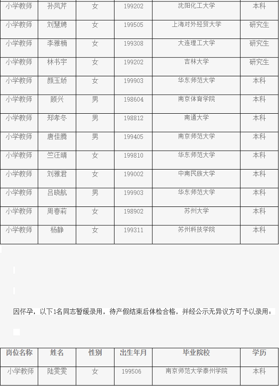 根據(jù)《2021年蘇州市吳中區(qū)華東師范大學蘇州灣實驗小學招聘管理人員及教師簡章》,經(jīng)過筆試、面試、體檢和政審合格,擬錄用以下33名同志,現(xiàn)公示如下: