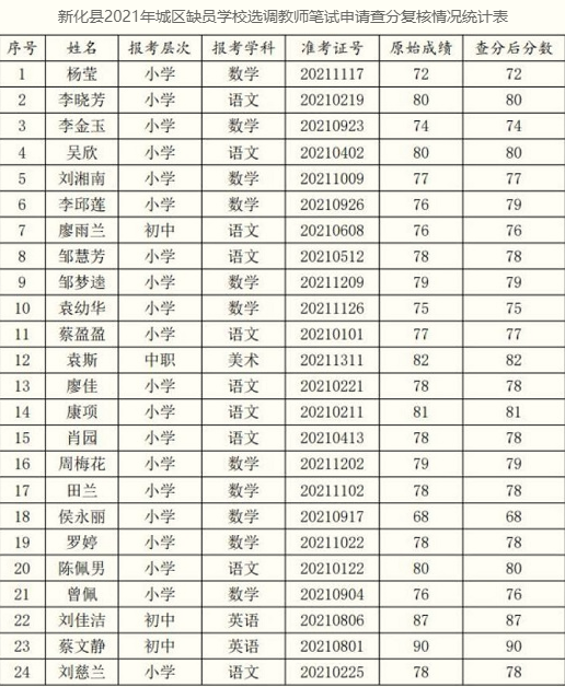 附:新化縣2021年城區(qū)缺員學(xué)校選調(diào)教師筆試申請查分復(fù)核情況統(tǒng)計表